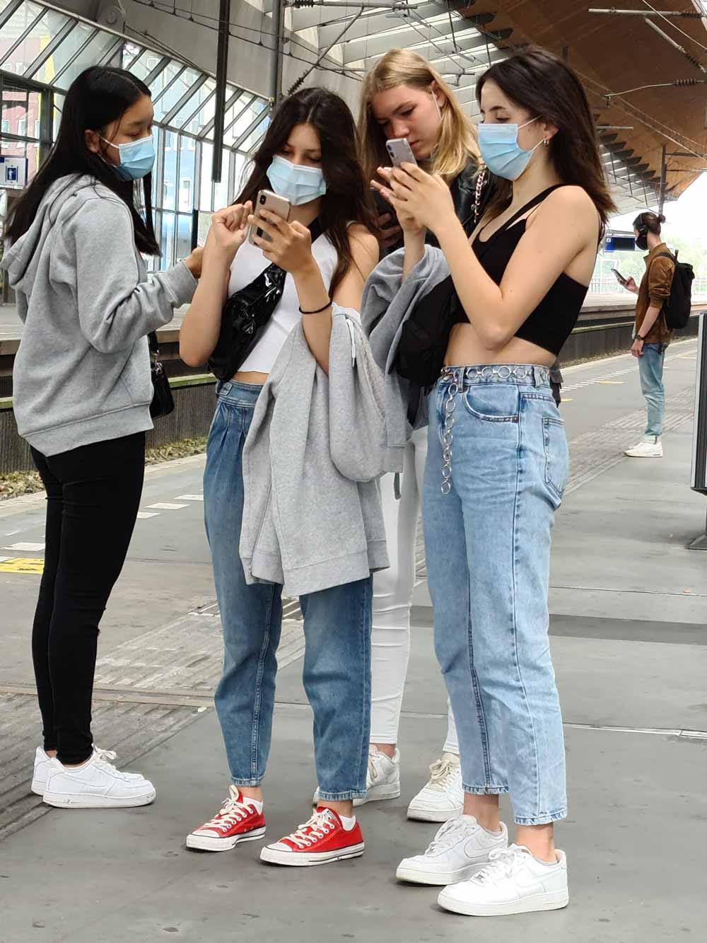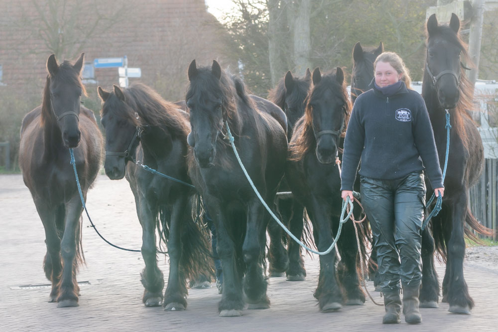 Early morning with the Friesian horses. A young woman, a co-worker of ‘Puur Terschelling’ brings a group Friesian horses on the reins to the stable. Oosterend, Terschelling, province Friesland, the NetherlandsA moment among us. Man and child sit together on a street bench on a sunny shopping day with social distancing restrictions. Street photography, Utrecht, Netherlands.Outing in corona time. Four girls in the Amsterdam Bijlmer ArenA train station with facemasks on, check their smartphones for the selfies they have just taken. Streets of Amsterdam, Street Photography, Amsterdam, Netherlands