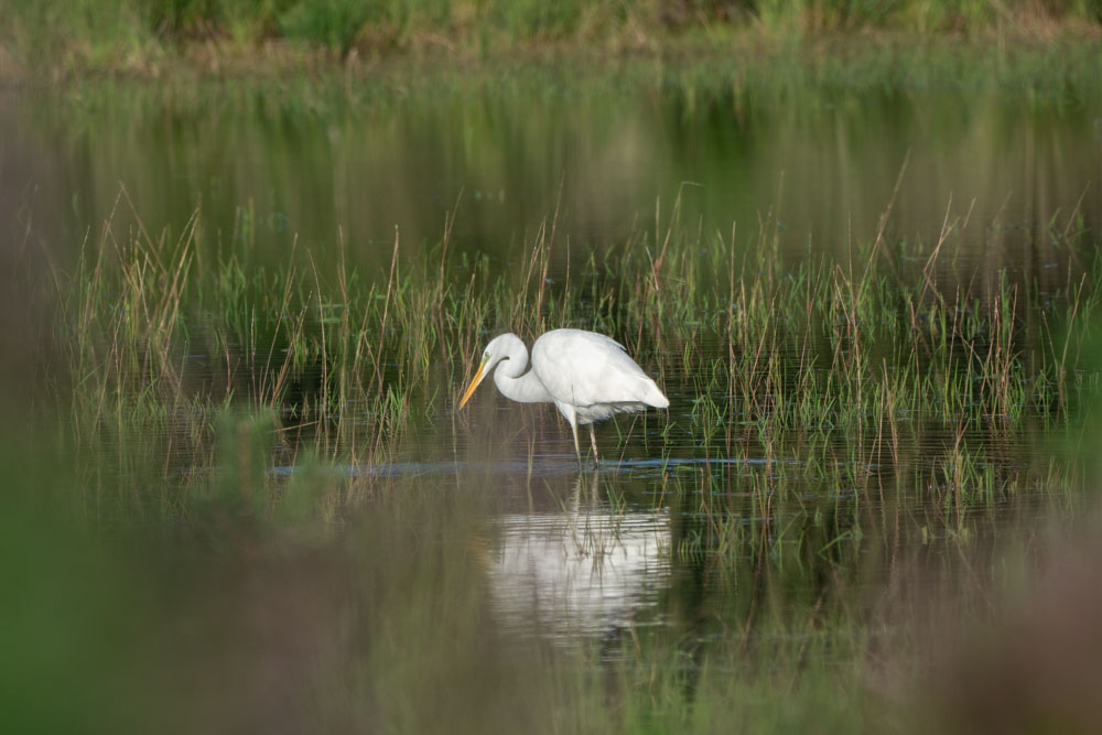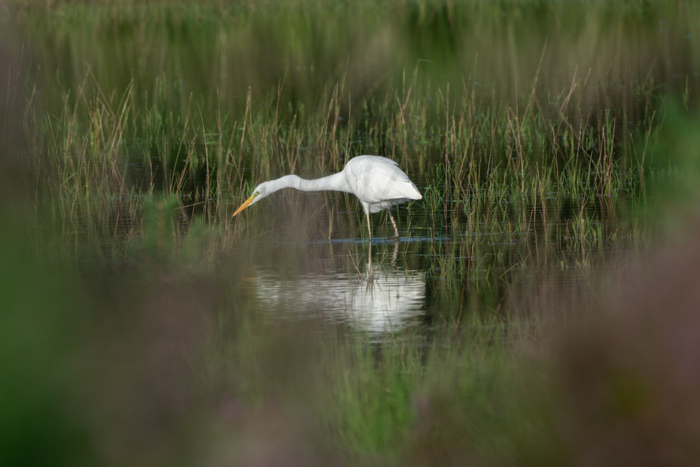 During my walk through the Kalmthoutse Heide this week, I first went to take a look at the Putse Moer, a fen and swampy heathland area. Through the website of observations.be I had already seen in advance that egrets had been sighted there, so I was on my guard. Even before I reached the fen I saw a great egret flying up. On the water I saw another group of birds foraging, but I knew they would be on their gard too. Carefully, staying low behind the bushes I tried to get a little closer, the camera at the ready. The result: a series of photos of the great and little egret, in which the difference between the two species is clearly visible.
