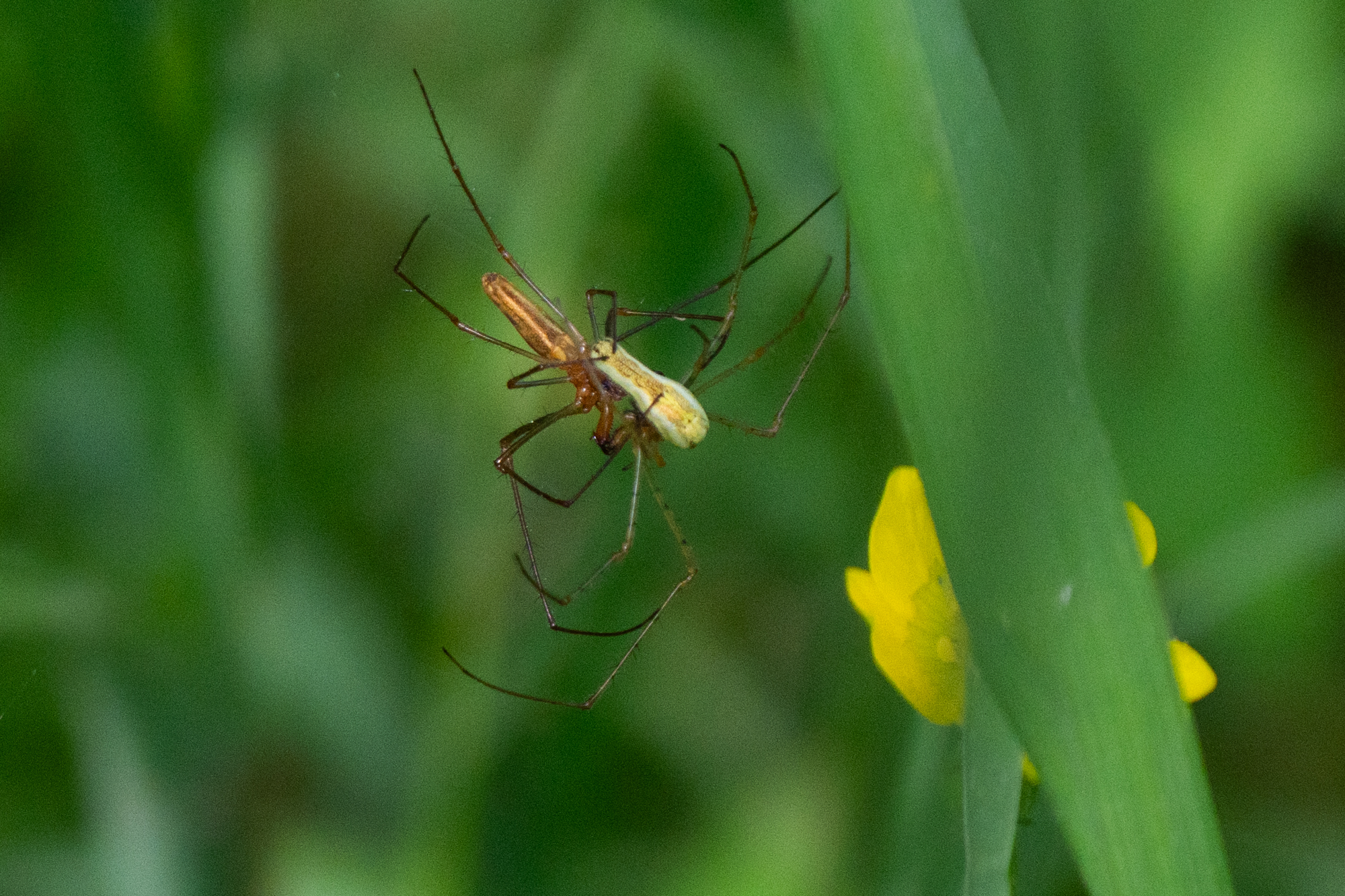Long Jawed spider male in stretch poseTaps a stretched web threadStrekspin vrouw verschijnt – bevruchtingFemale spider appears – fertilizationThreads come out of the abdomenA net is being madeYellow eggs are addedEgg package almost readyMating Long Jawed spiders Family Tetragnathidae – species still unknown. 2025-05-31 Riethoek, Amsterdam Zuidoost