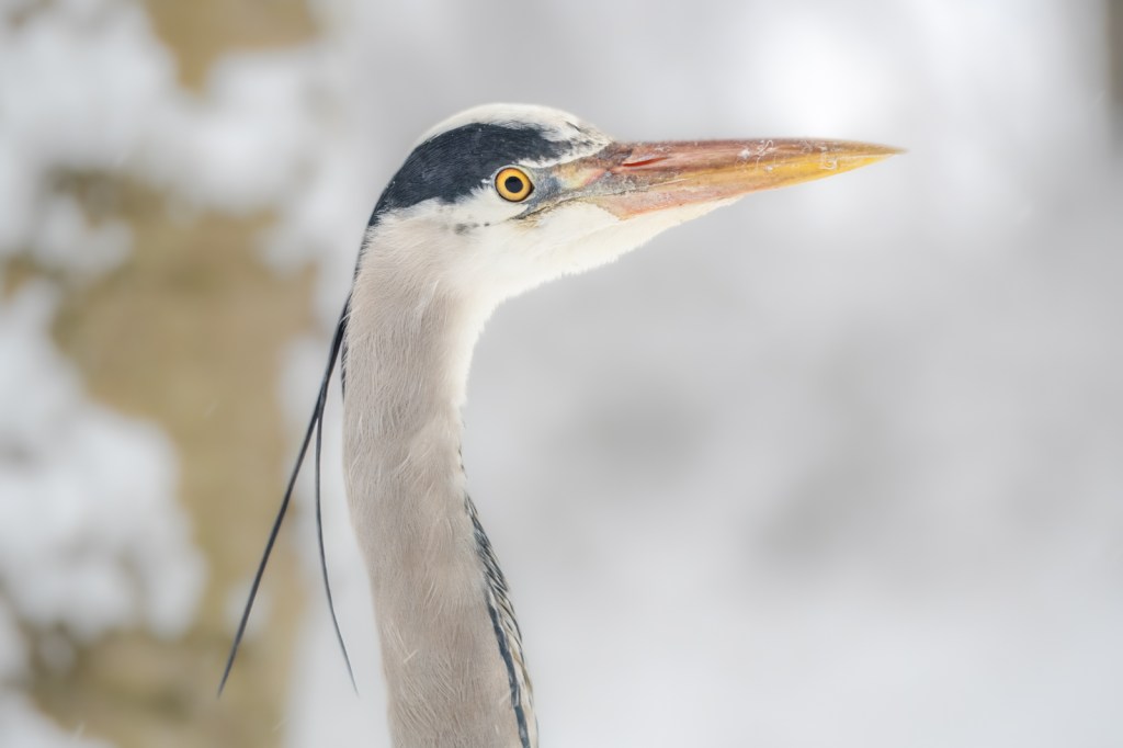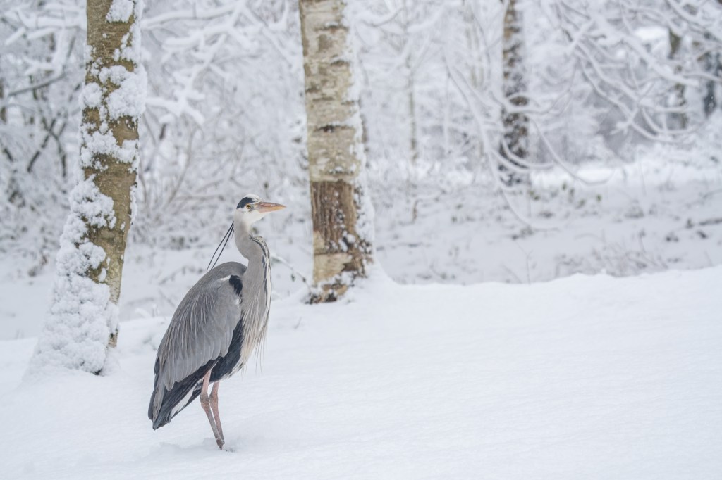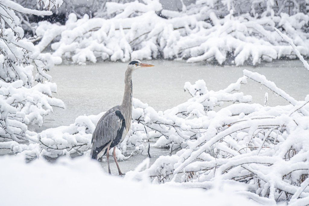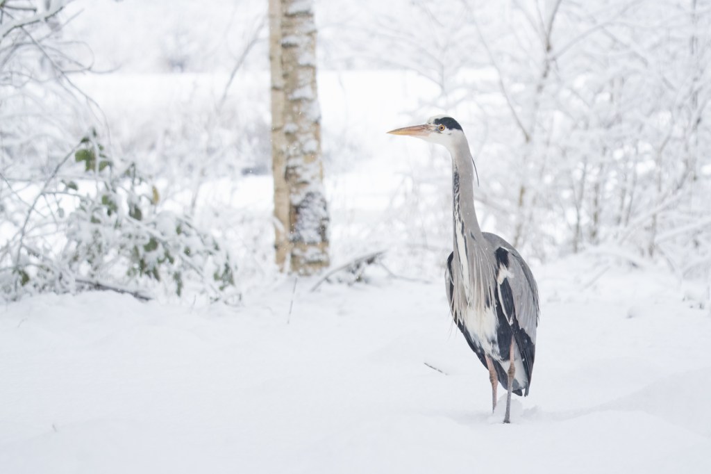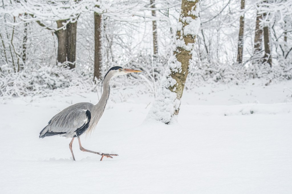 I’m sure I wasn’t the only photographer out there with my camera this Monday, right after the first snowfall of the year… We haven’t had such a thick layer of snow in years, and it resulted in fantastic images! In my local area: Bijlmerweide in Amsterdam Zuidoost, I was able to photograph this grey heron—first from a distance, in the landscape near the water, in the falling snow. Later, he gradually came closer.